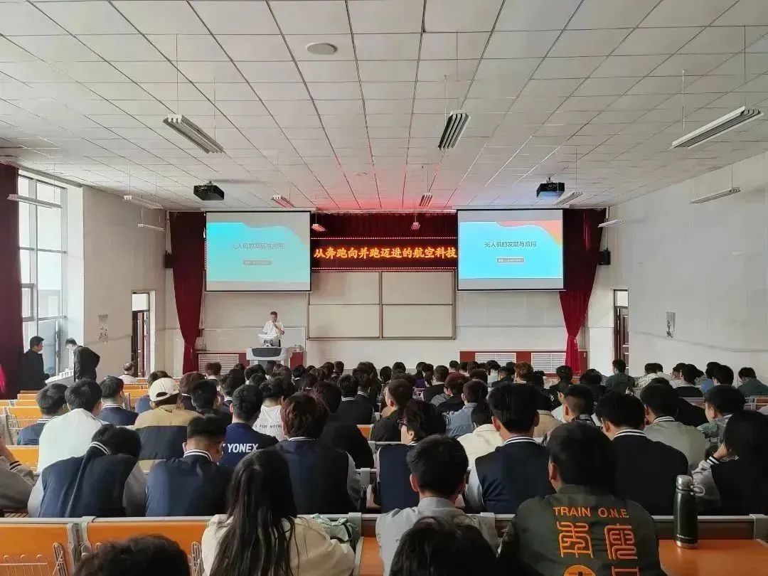 本次讲座的主讲老师是中国老教授协会理事,北航“关工委”常务副秘书长、北航老教授报告团副团长陈志英教授和全国航空工业职业教育教学编导委员会无人机专编委、中国航空学会无人机分会委员胡强。陈志英教授为大家讲述了“从奔跑向并跑迈进的航空科技”“飞机为什么能飞?”“飞机是逆着风起飞还是一路顺风?”“无动力,只有翼能飞吗?”“有动力,无机翼能飞吗?”一系列有趣的问题,将同学们迅速带入了航空航天的世界。伯努利原理、万户飞天、莱特兄弟、1121包头空难……陈教授的例证囊括了古今中外的典型案例,既通俗易懂又妙趣横生。